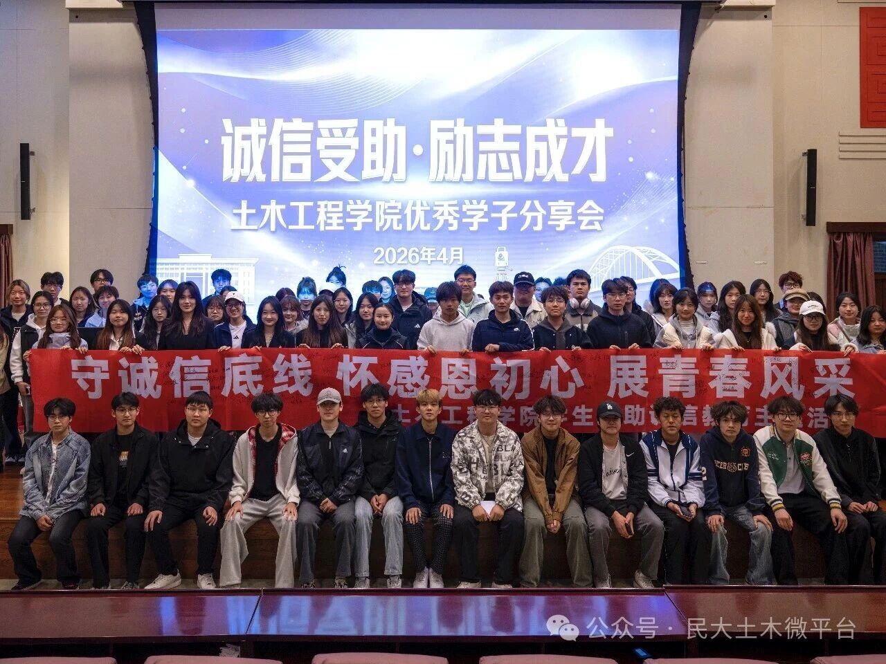 初心传薪火,励志启新程。4月13日土木工程学院“诚信受助·励志成才”优秀学子分享会在D103圆满落幕。各年级学生代表齐聚一堂,聆听榜样故事,感悟诚信力量,共赴一场成长与奋进的相遇。