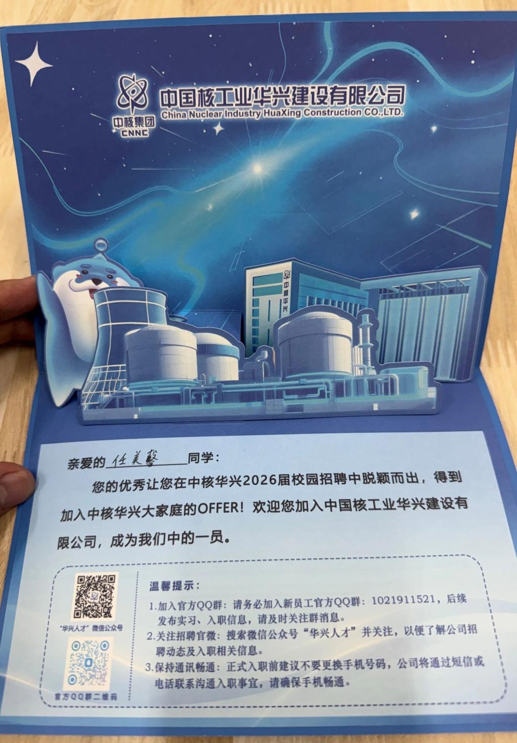 本次中核华兴建设有限公司(央企)宣讲招聘活动中,学院共计有毕鹤尧、李淑娴、林志宏、孙有黎、任美馨、崔文迪、吴恩娜、张千、安笑含、刘成博、龙江玥、罗晨洋、胡小宇、吕佳澎等共计14位同学顺利实现签约。恭喜以上同学成为“新核人”,在未来深度参与国家清洁能源工程建设,为服务国家“一带一路”事业发展贡献“土木学子”的青春与智慧。