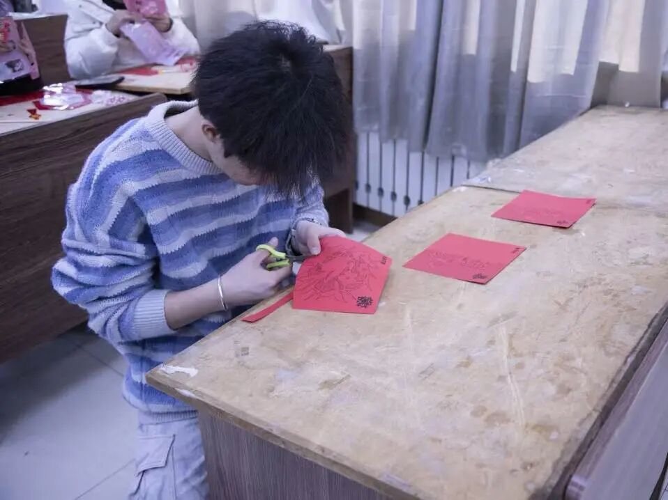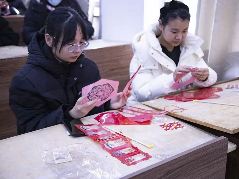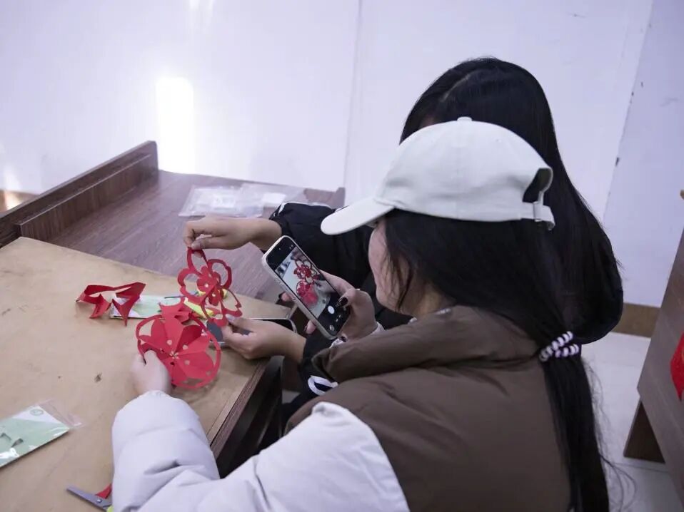 巧手生花区内,剪刀翻飞、红纸流转,大家跟随指导认真剪裁,一朵朵精致的窗花、一个个喜庆的福字相继成型,尽显创意与巧思。