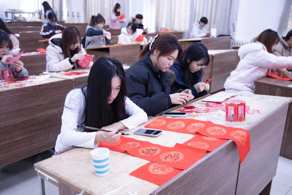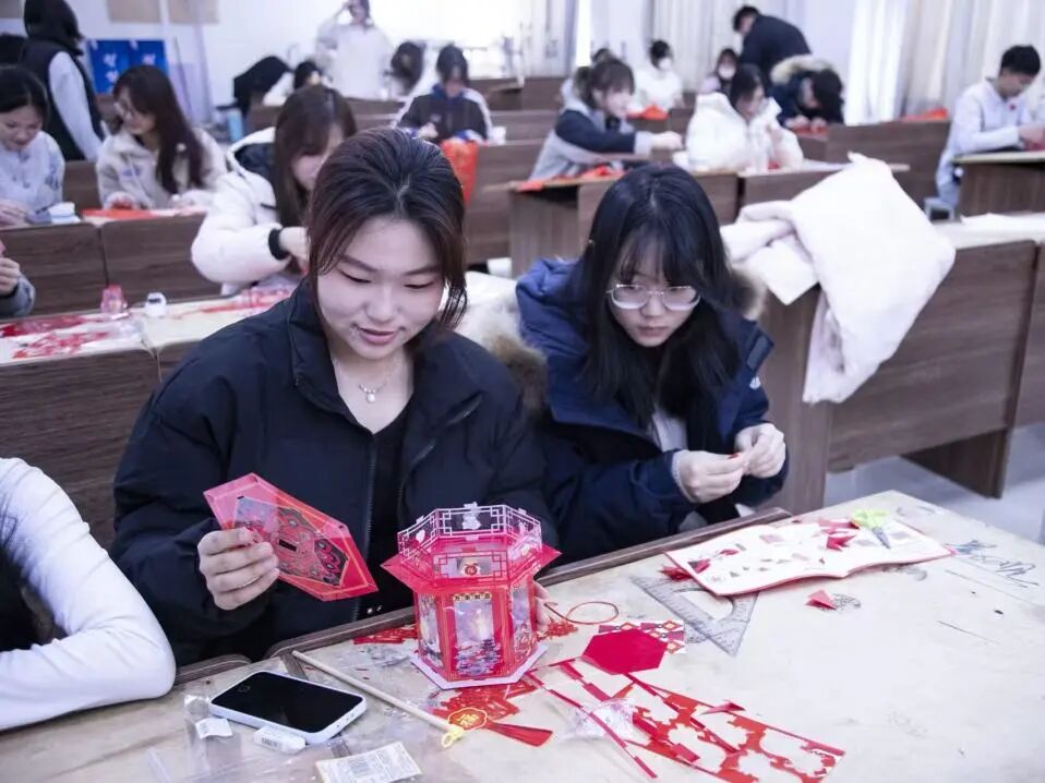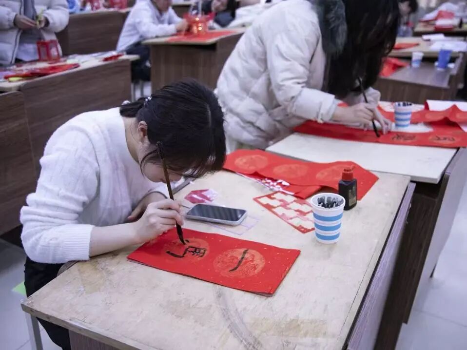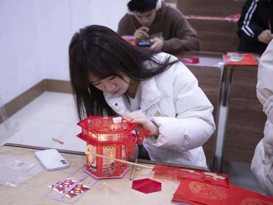 活动现场暖意融融,“笔墨纳福”“巧手生花”“匠心制灯”三大体验区,吸引了师生驻足参与。