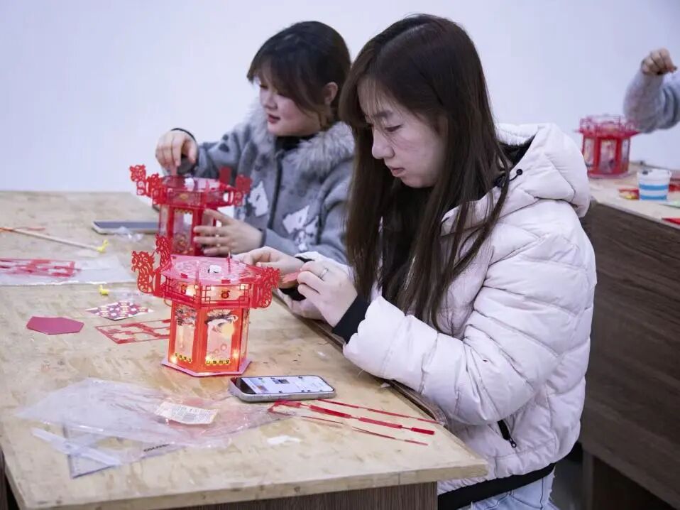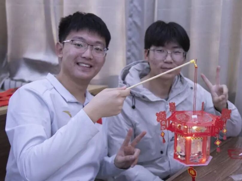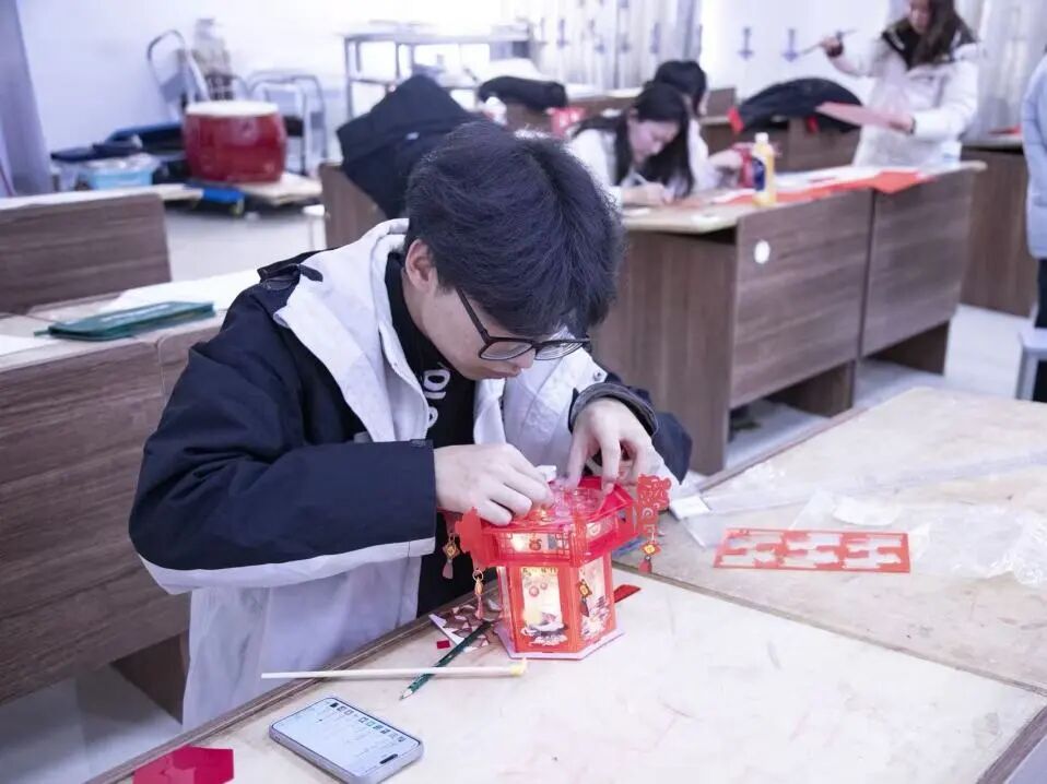 匠心制灯区更是热闹非凡,竹篾、宣纸、流苏等材料一应俱全,师生们互帮互助、搭骨架、糊灯面、饰流苏,一盏盏承载着希望的传统灯笼在手中点亮,映照出一张张洋溢着笑容的脸庞。