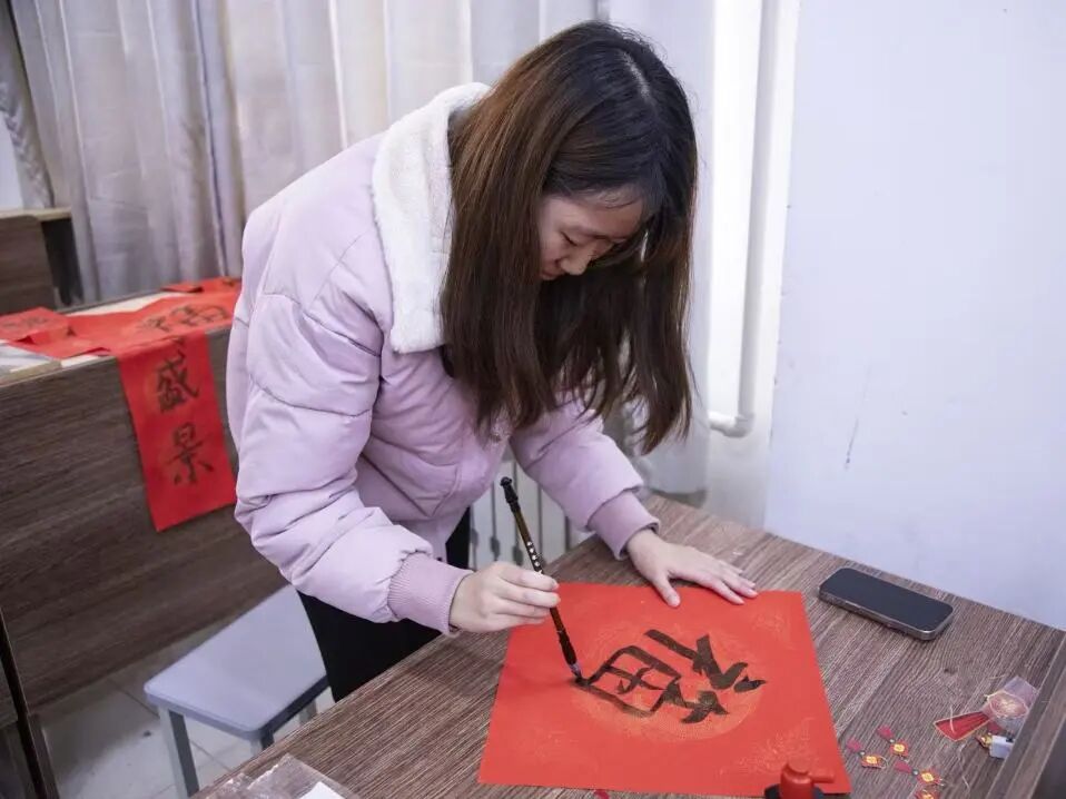 笔墨纳福区里,红纸铺展、墨香四溢,师生们挥毫泼墨,将对新年的美好期许凝于笔端,一副副寓意吉祥的春联跃然纸上。