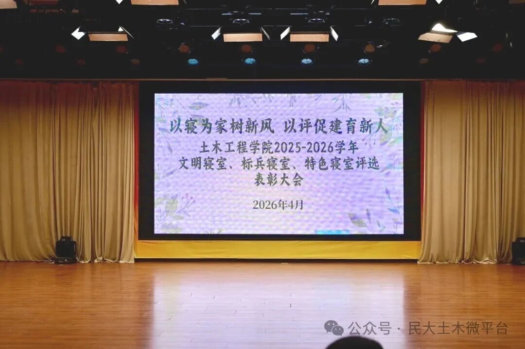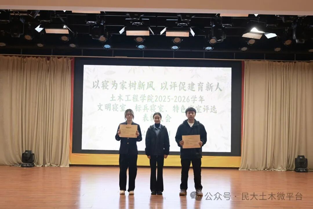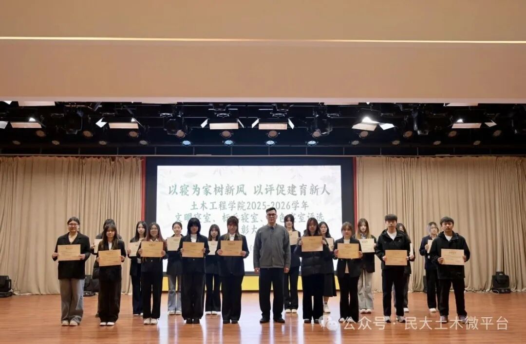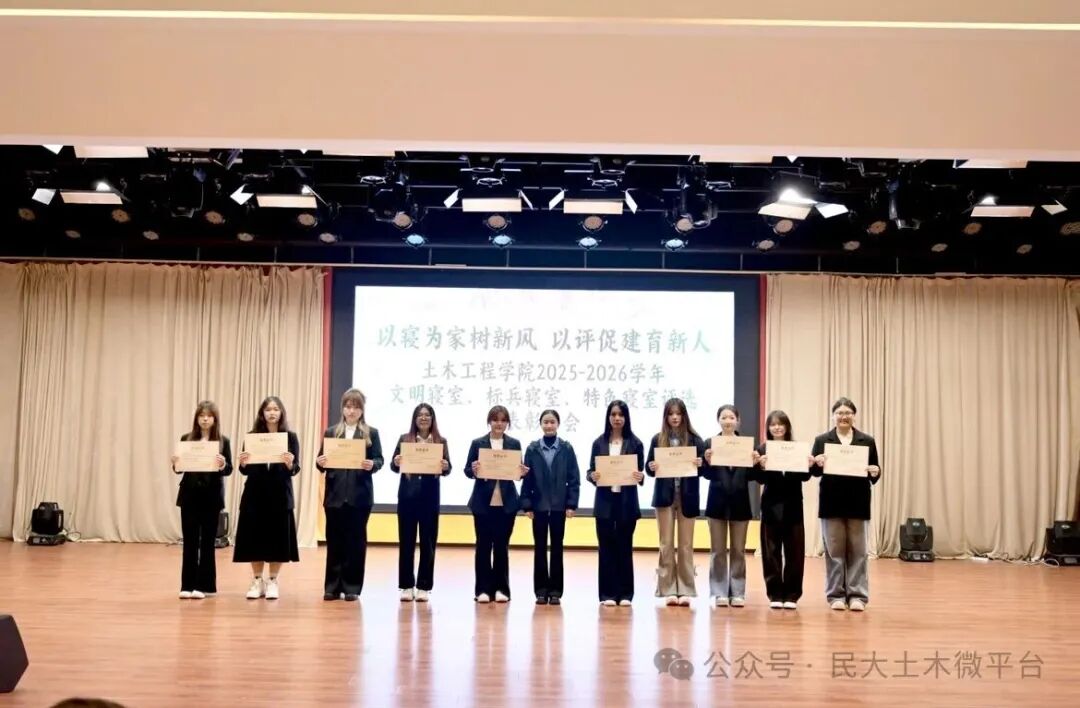土木芳华,寝筑美好。本次表彰大会不仅是对先进寝室的肯定与表彰,更是对全院学生的激励与指引。未来,土木工程学院将持续深化“一站式”学生社区建设,以寝室建设为抓手,不断厚植校园文化底蕴,培育优良学风班风,引导土木学子在温馨和谐的社区环境中,以梦为马、不负韶华,成长为有理想、敢担当、能吃苦、肯奋斗的新时代好青年,为学校内涵式高质量发展贡献微薄力量!